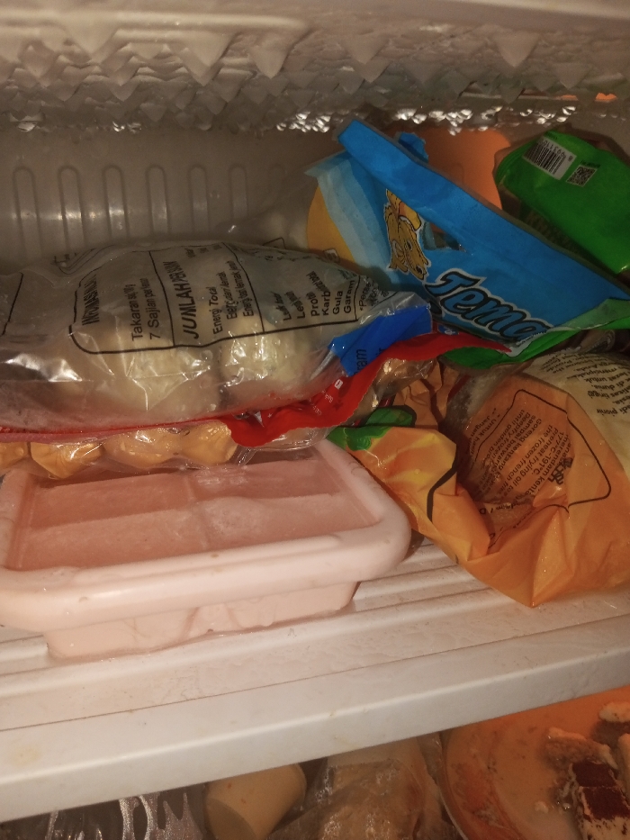 A partially stocked freezer shelf displays a variety of food items. Visible are packages of frozen goods, including fries, and meat products. A pink ice cube tray sits prominently in the foreground. The freezer's top section reveals a buildup of ice. The text on the packaging indicates information on serving sizes, nutritional value, and cooking instructions. The items are packed tightly together, indicating a full freezer.