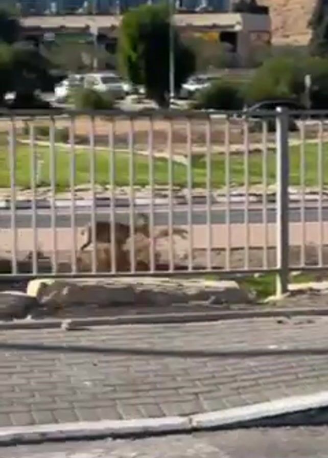 n ibex walking along a sidewalk next to a street. The ibex walks past a red fire hydrant, some parked cars, and a man holding a baby. The setting appears to be an urban environment with buildings visible in the background. The weather seems sunny and clear.