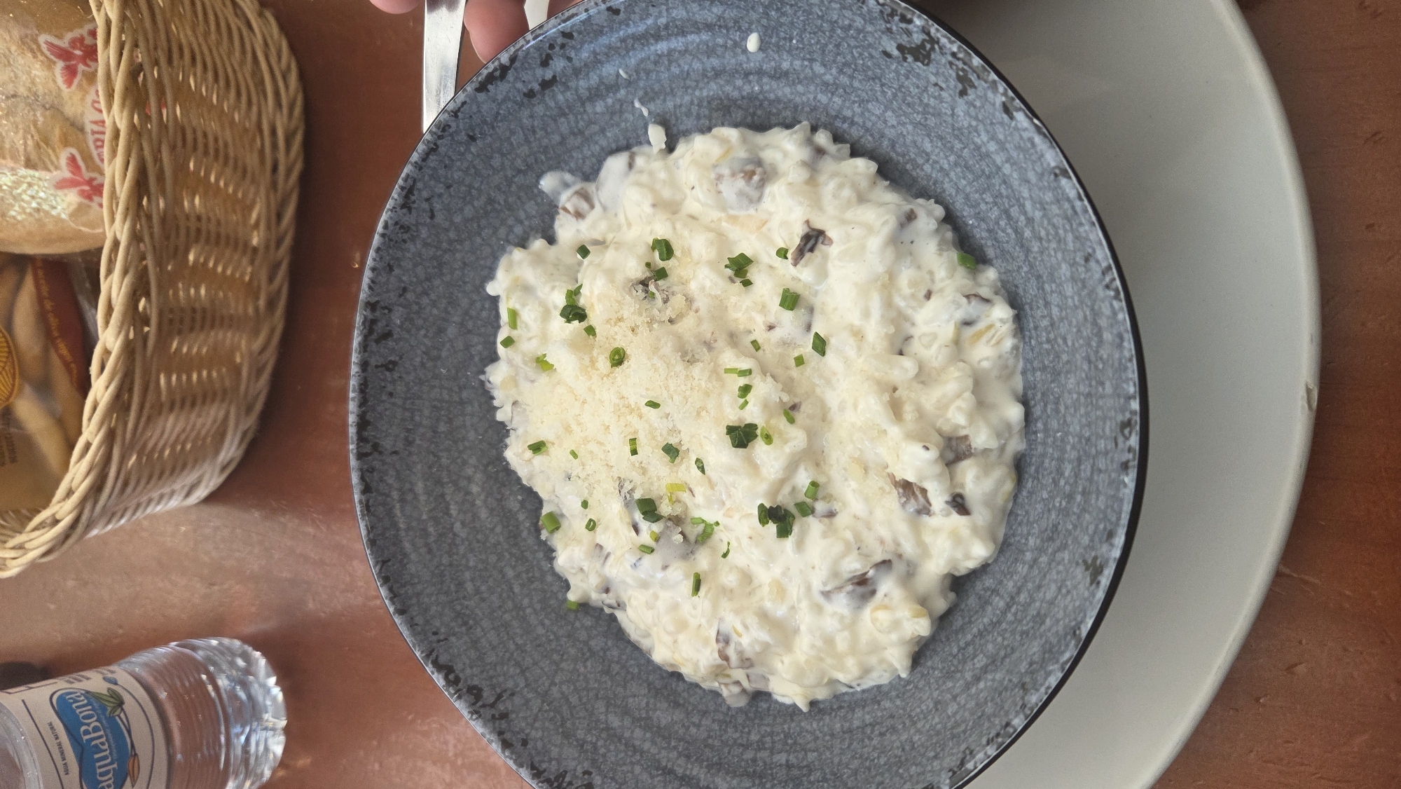 The image captures a close-up, elevated view of a dining table scene in a restaurant or cafe, specifically identified as being in Sevilla, Spain. The primary subject is a dark grey, textured ceramic bowl containing a serving of creamy white mushroom risotto, generously garnished with grated white cheese and finely chopped green chives. This bowl is positioned centrally and rests on a larger, plain white ceramic underplate. To the upper left of the frame, a clear plastic bottle of "AquaBona" natural mineral water, partially full, is visible. To the upper right, a woven wicker basket holds several bread rolls; one roll is partially wrapped in clear plastic packaging featuring red graphics and Spanish text. A light-skinned human hand is visible on the far right edge of the image, holding the metallic handle of an eating utensil (likely a fork or spoon) near the risotto bowl, indicating the presence of a diner. The table surface is a smooth, reddish-brown material.