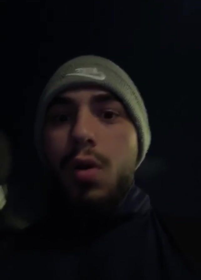 young man wearing a grey Nike beanie and dark jacket taking a selfie at night. Initially, his eyes are wide and mouth open in surprise, then he relaxes to a neutral expression. Two other people are briefly visible behind him; one is wearing a beanie and has a white graphic on their scarf or collar. The environment appears to be an urban setting, possibly near a road with streetlights.