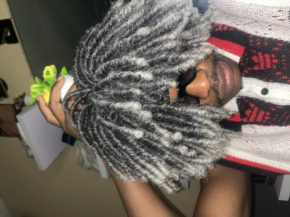 A person with long, gray dreadlocks holds a small, white pot containing yellow flowers. The individual wears sunglasses, and only the nose and lips are clearly visible. The person wears a cardigan with a red and black patterned design. The background appears to be an indoor setting, and an image can be seen on the wall behind the person. The image is rotated sideways.