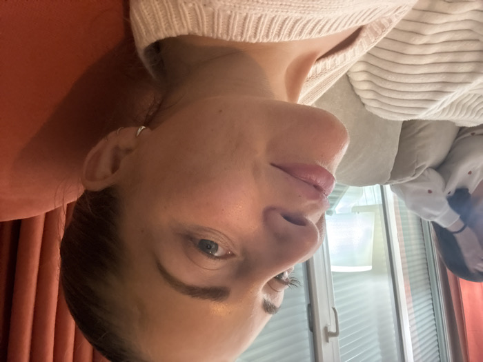 A woman reclines on an orange couch, wearing a light pink knit sweater. Her hair is pulled back, revealing silver hoop earrings. She looks towards the camera with a neutral expression. Behind her, a partially visible window shows daylight and light-colored blinds. A fluffy white blanket or pillow sits to her right. The image has a slight tilt, and the focus is primarily on the woman's face.