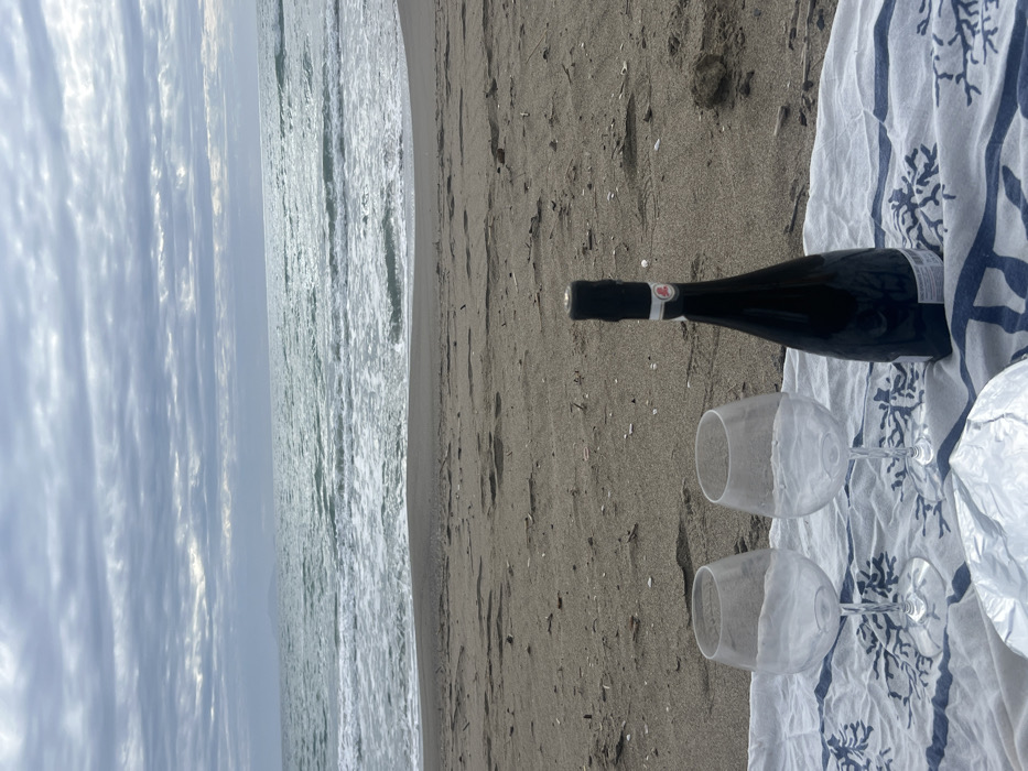 The image displays a beach scene in Castiglione della Pescaia, Italy, viewed from a low perspective. In the foreground, a white blanket with a blue, patterned design is spread on the sandy surface. Placed on the blanket are two empty, clear stemmed wine glasses and a dark-colored bottle, appearing to be wine, with a black foil cap and a white label visible near its base. A silver-wrapped object, possibly food, is partially visible at the bottom left corner on the blanket. The midground consists of damp, light brown sand extending towards the water, showing minor undulations and scattered dark specks. The background features the Mediterranean Sea with moderate waves breaking near the shore, exhibiting white foam. A distant, faint landmass or island is discernible on the horizon to the left. The sky above is entirely overcast with layered, gray clouds. No people are visible in the scene.