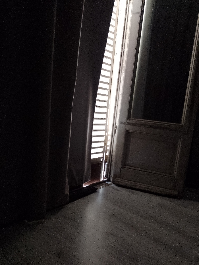 A dimly lit room features a partially open door framed by a curtain. Light streams through the door's shuttered window, casting a bright stripe across the floor. The door itself appears aged with visible paneling. The floor's surface shows a subtle wood grain texture. The curtain, heavy and dark, contrasts with the light near the door.