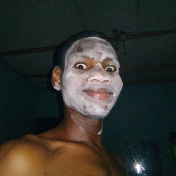 The image displays a dark-skinned male subject, captured from the mid-chest up, situated indoors in the city of Nsugbe, Nigeria. The subject's face is largely covered with a thick, white, creamy substance, consistent with a facial mask, leaving the eyes, nostrils, and mouth exposed. His eyes are wide open, pupils visible, and his lips are closed in a slight smirk. His hair is dark and appears short. The upper torso is bare, revealing dark skin, with a minor streak of the white substance present on the right clavicular area. The background consists of an undifferentiated dark interior, featuring a horizontal wooden structural element across the upper frame. Ambient lighting is low, and a distinct light reflection is present in the lower right quadrant of the image. The subject is looking directly at the camera.