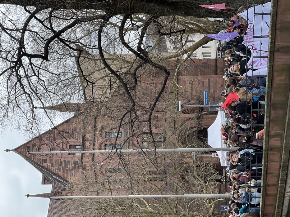 The image depicts an outdoor gathering on the Platz der Universität in Freiburg im Breisgau, Germany