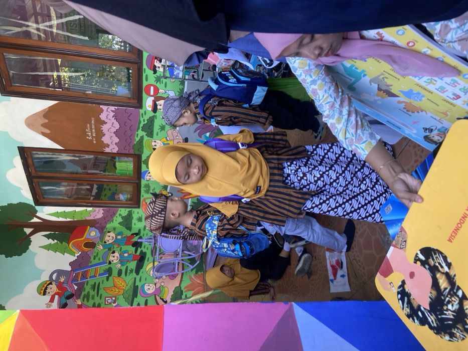 Several young children in traditional Javanese attire rest indoors. A girl in a mustard-colored hijab and brown striped top lies asleep, seemingly on another child. Other children, also in similar traditional headwear and clothing, appear to be seated or resting nearby. A colorful wall mural with cartoon characters and painted windows serves as a backdrop. A large yellow board with Indonesian text is partially visible in the foreground. An adult's arm and patterned garment are also in the frame.