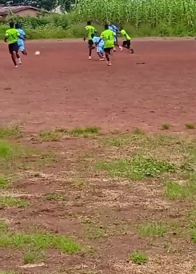 soccer game being played on a dirt field with patches of green grass. The players are wearing different colored jerseys. Some wear neon green with black shorts, while others are in light blue. They are actively running around the field, presumably chasing a soccer ball, though the ball is not clearly visible. The surrounding environment includes some greenery and trees in the background, along with a few buildings in the distance. The sky appears overcast.