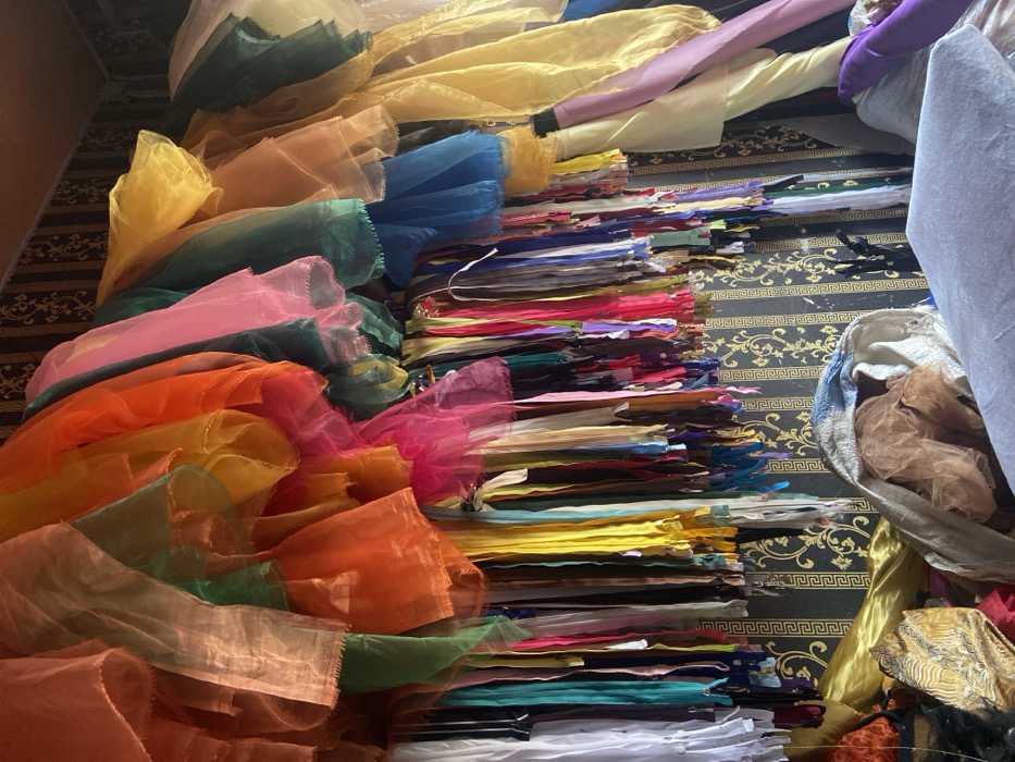 The image displays an interior space in Ojoto, Nigeria, characterized by a large quantity of textile materials and notions