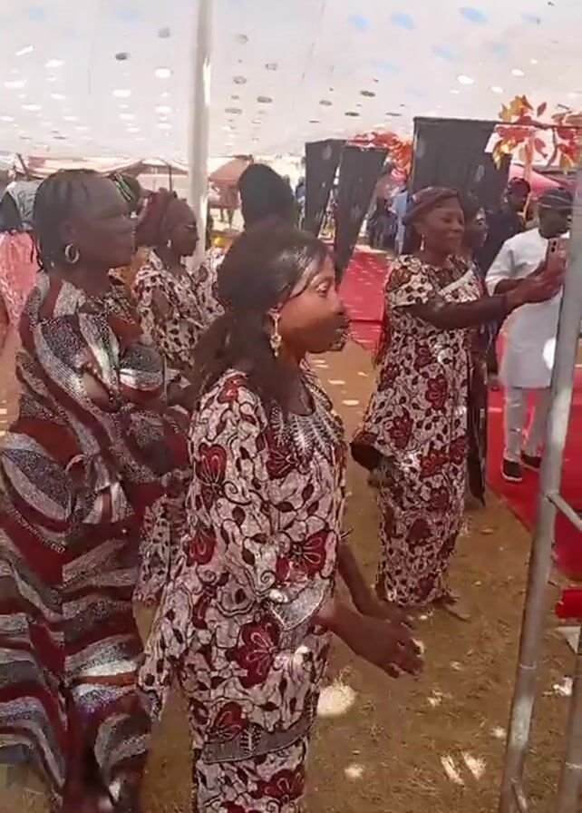 group of women standing in an outdoor event space covered by a large white canopy, decorated with blue and white dots. The ground is covered in dry grass. The women are wearing matching dresses with brown and red patterns. Some of the women wear headwraps. A man in the background, wearing white, is using a phone to record. There are red flower arrangements on a metal stand to the right of the frame.
