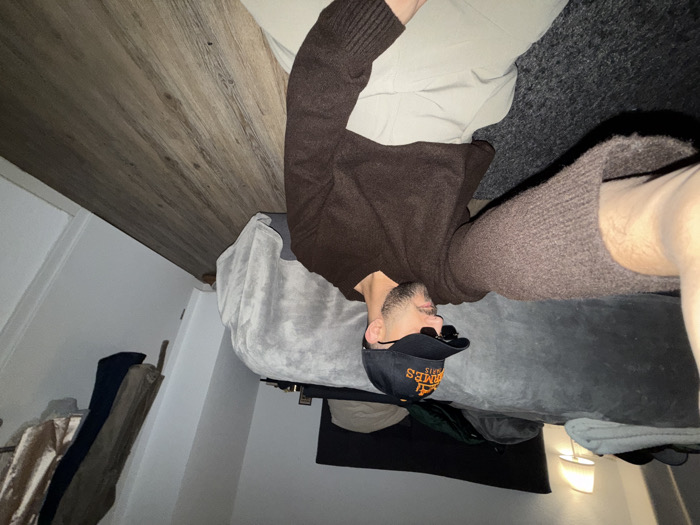 A person lies upside down on a gray sofa. The person wears a brown sweater, light pants, sunglasses, and a black cap with orange lettering. A gray carpet is beside the sofa. A white wall with a doorway is behind the sofa. Clothing hangs in the background. The lighting is dim.