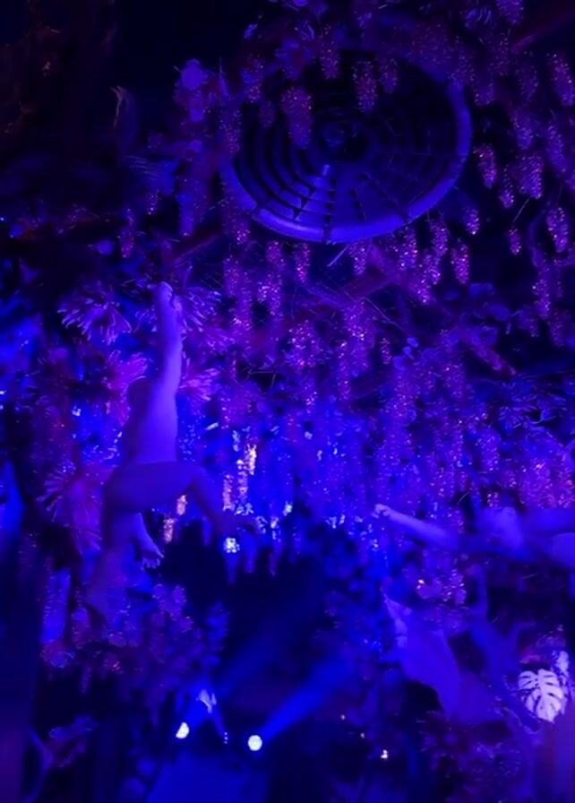 night club or bar scene with a dark and vibrant blue lighting scheme. The ceiling is adorned with hanging decorations, possibly artificial flowers or vines, interspersed with numerous small, sparkling lights. Two human-like figures, possibly mannequins, are suspended from the ceiling, appearing to hang amidst the floral decorations. A large, circular air vent is also visible on the ceiling. The presence of the figures and hanging decorations gives the space an immersive, artistic feel. At the bottom of the frame, the silhouettes of people can be seen, indicating patrons in the establishment. Overall, the ambiance is energetic and lively, typical of a nightclub or a stylish bar.