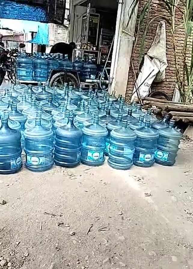 large collection of blue water jugs lined up on a concrete surface. A few jugs are loaded on a motorized tricycle parked behind the others. A brick building is in the background, along with some vegetation. A motorcycle and a parked truck can also be seen in the background. A man walks into view on the left of the frame.