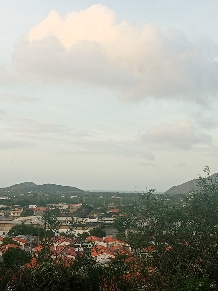 A high-angle, daytime shot of a town under a partly cloudy sky. The architecture includes buildings with red roofs. Green foliage is present in the foreground, slightly obscuring the view. In the background, hills are visible and the sky transitions from a clear expanse to an area filled with soft, white clouds.