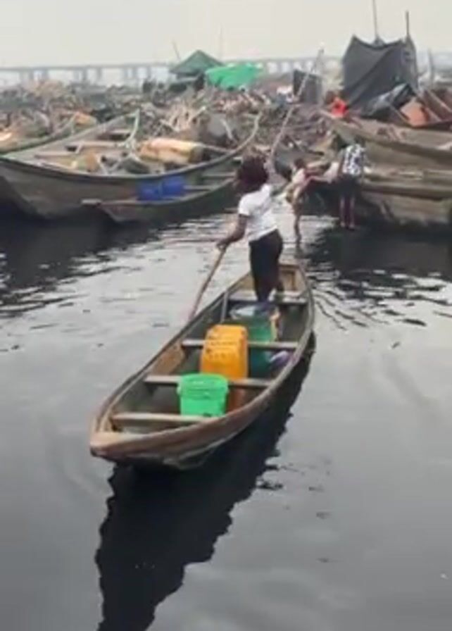 A young woman propels a small, narrow wooden boat through a body of water using a long wooden pole. The water appears dark, possibly polluted. The boat contains several colorful plastic containers. Numerous other boats are moored nearby, creating a crowded environment. In the background, a large bridge structure can be seen through a misty haze. Several people are near the other boats, apparently engaged in tasks or activities. The overall atmosphere is one of a working waterfront with a sense of urban poverty.