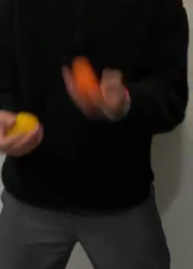A man in a black fleece zip-up jacket and grey pants is juggling three pieces of fruit against a plain white wall. The fruit include a yellow lemon, a brown kiwi and an orange. He stands still and alternates throwing the fruit in the air, keeping two in his hands at any given time.