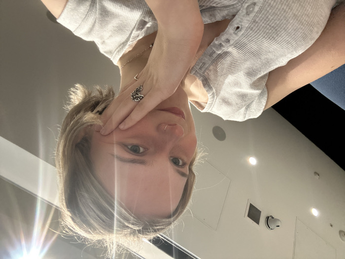 A single female subject, estimated 18-25 years old, is depicted in a close-up, slightly upward-angled shot. She possesses short, light-colored hair, fair complexion, and light-colored eyes. A small ring piercing is visible in her left nostril. She wears a light grey, ribbed, short-sleeved top with a button placket, and a thin silver necklace with a small pendant. A silver ring featuring an ornate design is on her left ring finger. Her left hand is positioned with the palm against her left cheek. She looks directly at the camera with a subtle smile. The upper background reveals a white ceiling structure equipped with multiple recessed light fixtures, a white dome security camera, and a dark square ventilation grate. A significant lens flare originates from the upper right of the frame. Based on the visible architectural elements, the specific location within the city of Vancouver, Canada, cannot be definitively identified.
