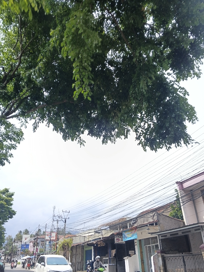 A street scene is shown under a dense tree canopy. Buildings line the street, with a jumble of power lines overhead. Vehicles, including a white car and motorcycles, are visible on the road. The sky is overcast, casting a soft light on the scene. There are power lines on top of the houses.