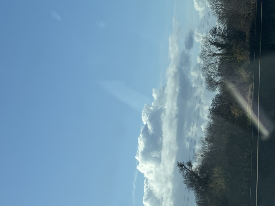 The image displays an exterior scene in Illkirch-Graffenstaden, France, under a partly cloudy sky. The upper two-thirds of the frame show a clear blue sky interspersed with various white and grey cumulus cloud formations, with a prominent, dense cluster in the middle-left. Below the clouds, a horizon line of dense, mostly leafless deciduous trees and shrubs is visible, stretching across the width of the frame. Several large, spherical masses of mistletoe are present within the upper branches of a tree on the far left. Two thin, dark utility lines are discernible, spanning horizontally across the image above the tree line in the middle ground. The lower portion of the image is occupied by a dark, horizontal, indistinct surface, likely a vehicle dashboard or a roadside barrier, which exhibits prominent, elongated reflections or lens flares consistent with sunlight. No individuals, animals, or specific actions are depicted. The environment appears to be a natural or semi-natural area adjacent to a roadway.