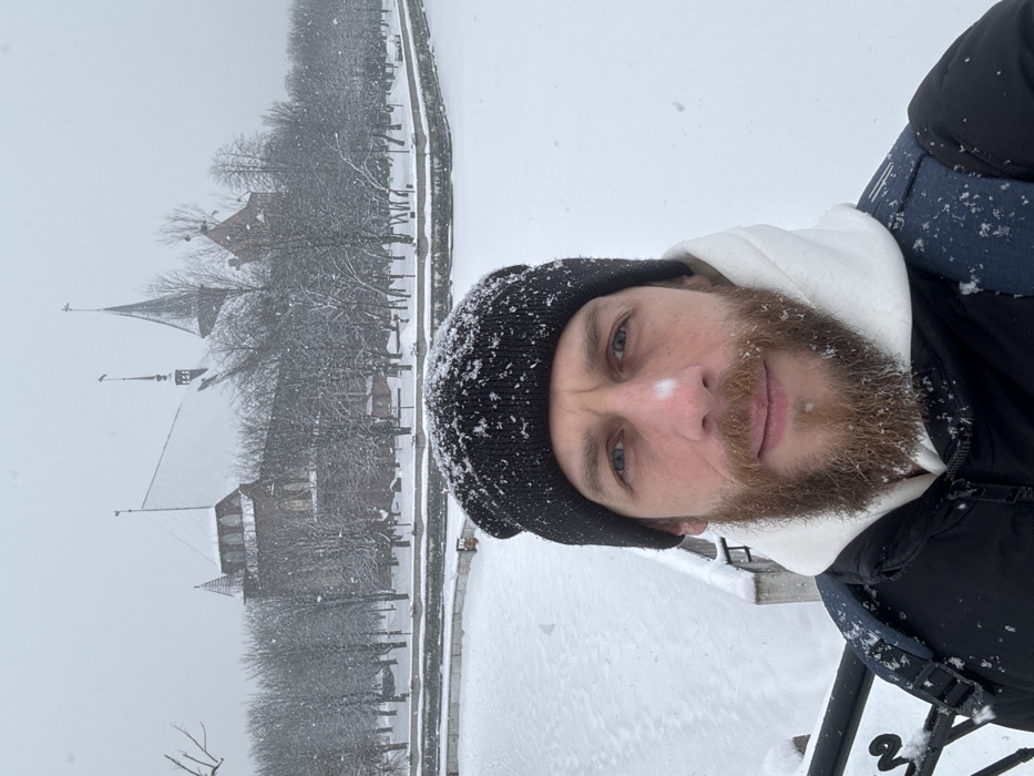 A male individual is captured in a selfie on a heavily snowing, overcast winter day in Kaliningrad, Russia