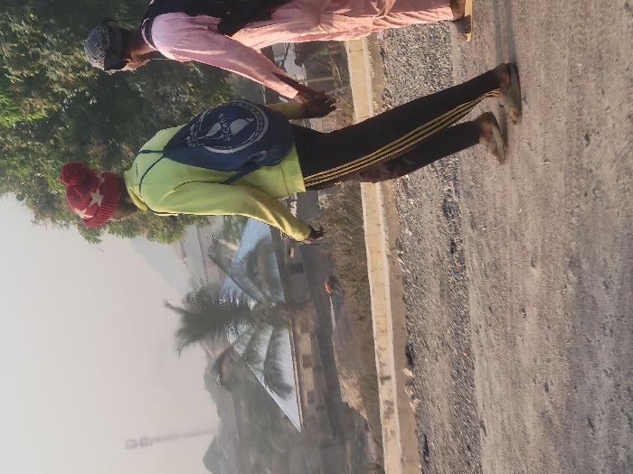Two individuals traverse a paved road alongside a concrete curb. The person in the foreground wears a bright yellow sweatshirt, black pants with yellow stripes, and a red knitted hat with white stars. They carry a blue and black backpack. The other person dons a light pink top and dark head covering. Lush green trees and a building with a metal roof stand in the background, obscured by a hazy sky.