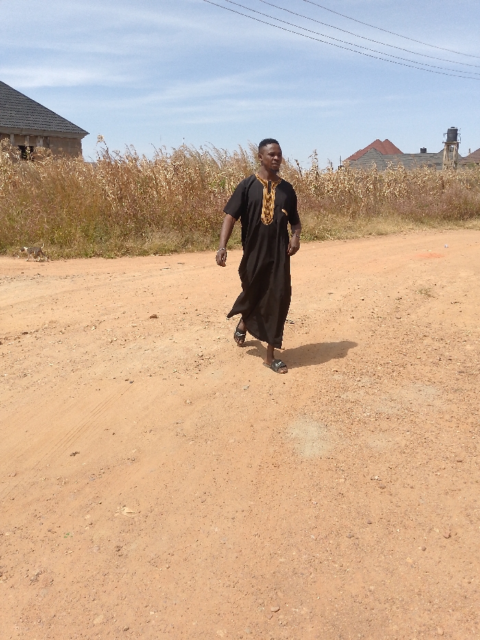 - "In Kwang, Nigeria, an adult male walks from left to right across a reddish-brown dirt road under a clear, bright sky" by FM-KVotS2, licensed under CC BY 4.0