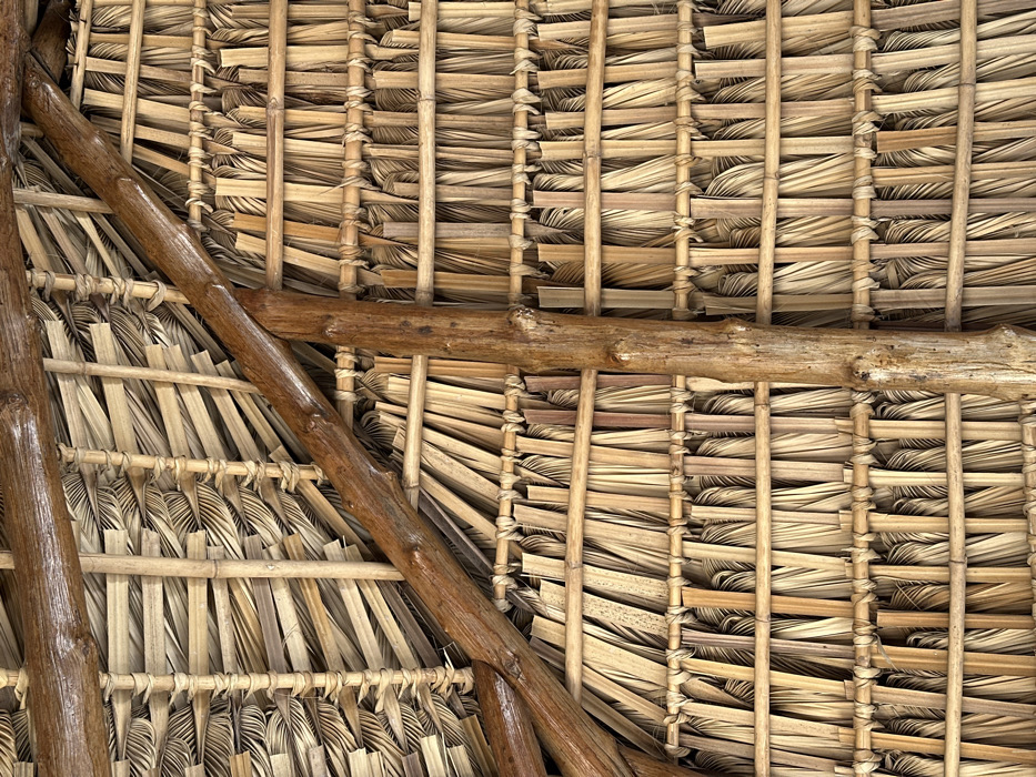 The image showcases the underside of a thatched roof