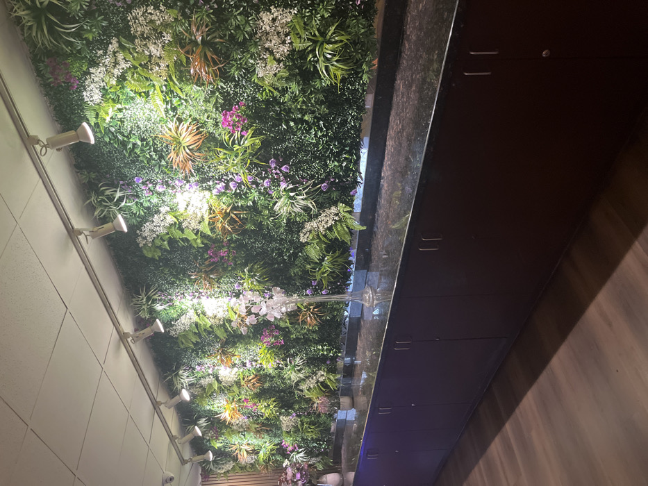 A lush vertical garden, bursting with greenery and interspersed with white, pink, and orange flowers, adorns a wall