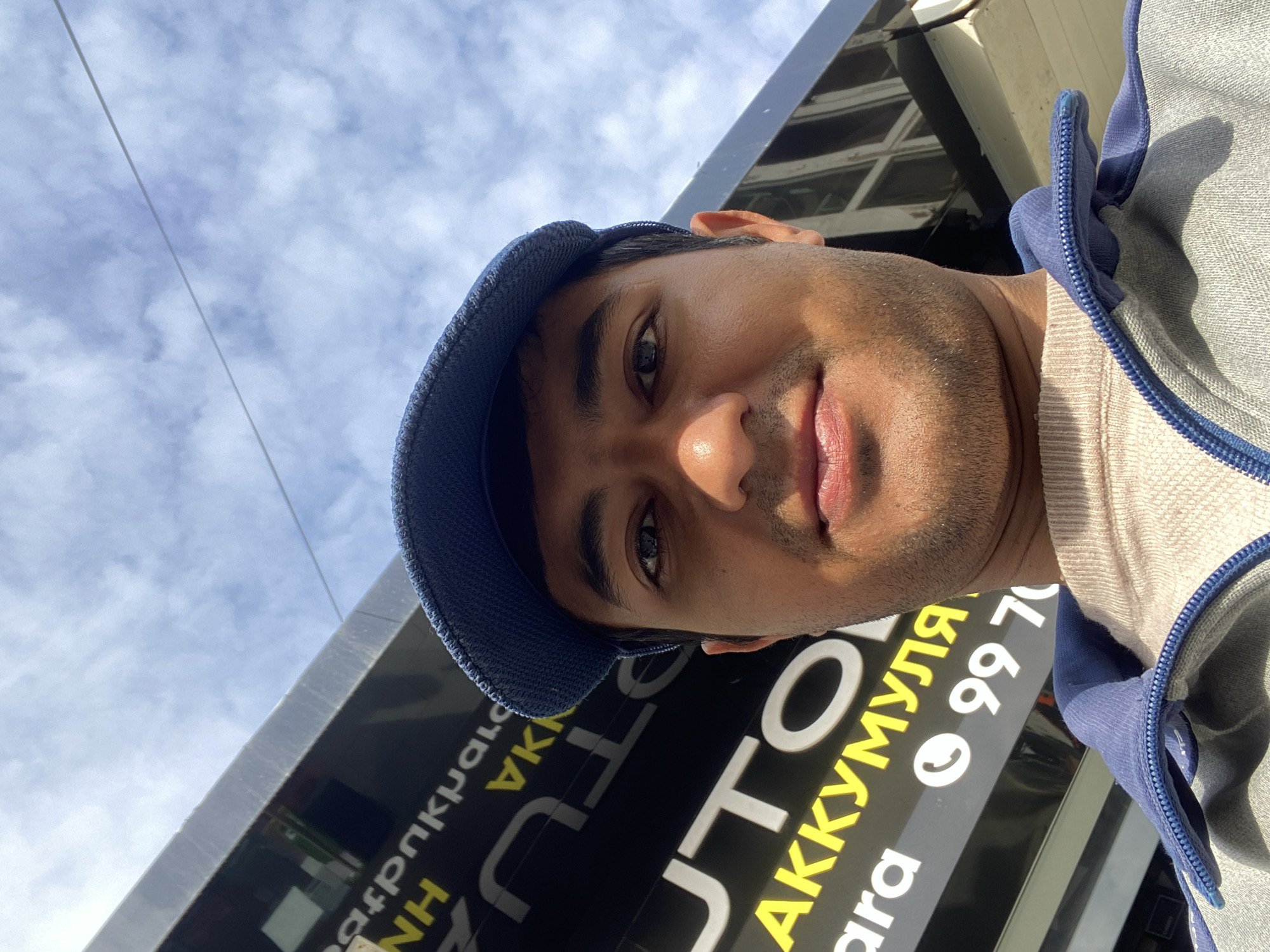 A low-angle, close-up photograph depicts a young adult male, facing the camera with a slight smile. He wears a dark blue flat cap, casting a shadow across his upper face, and is dressed in a light beige sweater under a grey zippered jacket with a blue collar. Behind him, a building's dark facade or sign is visible, featuring white and yellow Cyrillic text. Recognizable fragments include "UTO", "АККУМУЛЯ" (part of 'аккумуляторы' - batteries), "ara" (likely part of 'Бухара' - Bukhara), a phone icon, and the partial number "99 70". The sky above is blue with scattered white clouds, bisected by a thin utility wire in the upper right quadrant. The scene is illuminated by bright daylight, with direct sunlight on the lower portion of the subject's face. The text indicates the location is in Bukhara, Uzbekistan, at a business selling automotive batteries.