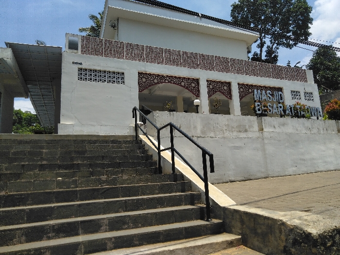 The image depicts an exterior view of a building identified as a mosque, located in the city of Unknown, Norway. The scene is observed from a low angle, looking upwards towards the building entrance. In the foreground, a wide set of approximately ten dark gray, rough-hewn stone steps leads upwards. A black metal handrail ascends alongside the steps on the right. Parallel to the stairs on the right is a lighter gray concrete ramp, also ascending. To the far right of the ramp, a paved area with light-colored rectangular pavers is visible. The main subject is a white, two-story building constructed of concrete or stucco. The lower section of the building's facade features a white wall with several square, perforated ventilation blocks. Above this, the central portion displays three prominent arched openings, likely entryways or windows, each framed with intricate reddish-brown decorative patterns. Two white-globled lamps are positioned in front of the central arched sections. A sign above these arches clearly reads "MASJID BESAR AT-TAQWA" in block letters, indicating it is a large mosque. The upper section of the facade features a continuous frieze with a brown and white geometric or calligraphic pattern. The building walls exhibit some visible cracking and discoloration. To the left of the main building, a separate, elevated structure with a sloped corrugated metal roof and white support columns is visible. This appears to be a covered walkway or an extension. Green foliage and trees are present in the background, particularly to the upper left and upper right, suggesting surrounding vegetation. The sky is bright blue with scattered white clouds, indicating clear daytime conditions. No individuals are present in the scene.