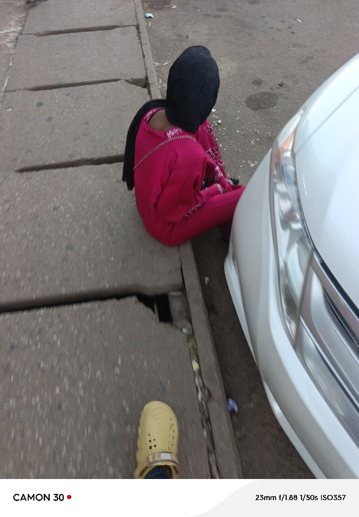 A person in a pink outfit and black head covering sits on a curb beside a white car. The curb is cracked and deteriorated, with an opening leading to a drain. The sidewalk adjacent to the curb is made of concrete slabs with visible cracks. A foot wearing a yellow clog is partially visible in the foreground, suggesting the photographer is standing nearby. The car's headlight and front bumper are prominent on the right side of the frame.