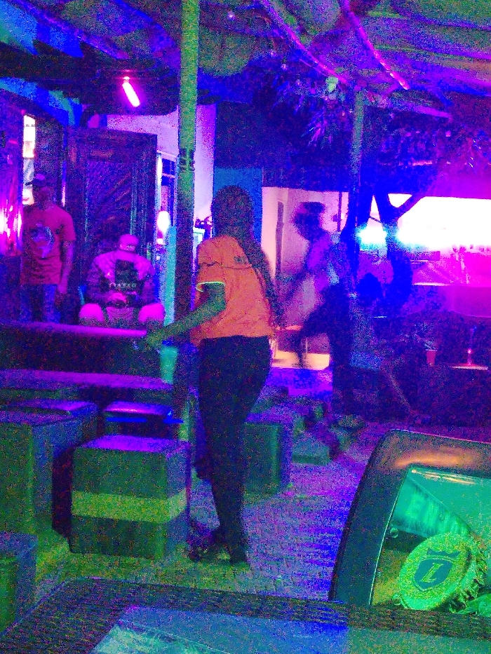 A vibrant, crowded space is bathed in blue and purple hues. Several individuals are present, including a woman in an orange shirt and dark pants standing in the foreground. Other people are seated or standing in the background, some blurred due to movement. The setting seems to be a bar or club, with various structures and elements visible, like pillars and seats.