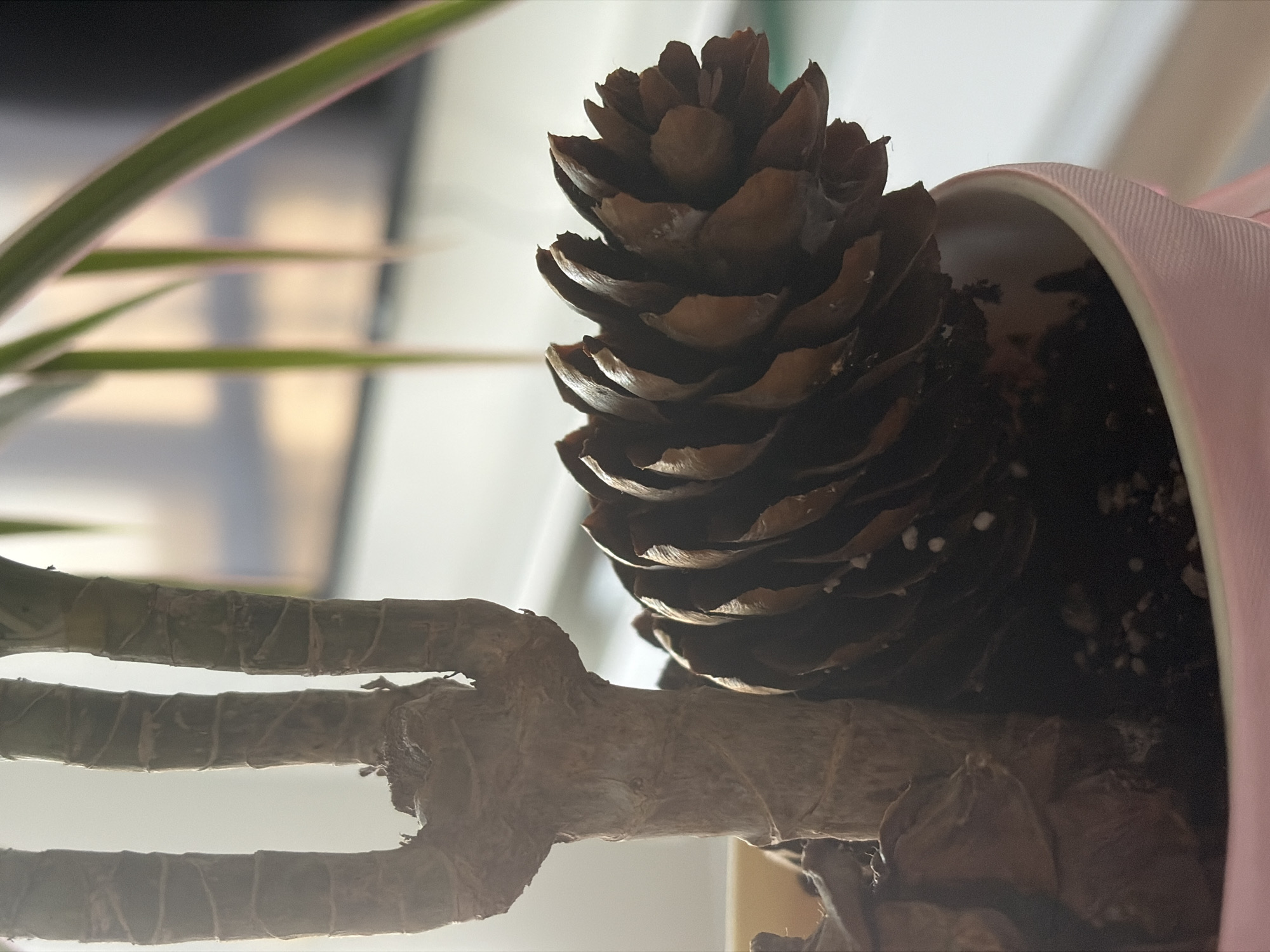 The scene is an interior, located in Yanino-1, Russia. A potted plant is centered within a light pink, textured pot. The plant exhibits multiple segmented, woody brown stems rising vertically from dark soil. A single, elongated, dark brown conifer pinecone rests horizontally on the soil surface, positioned to the right of the central plant stems. Small, white, granular particles are visible on the soil around the base of the plant and the pinecone. Faint, blurred green leaves with pinkish edges extend from the upper right portion of the plant. The background is indistinct and brightly lit, consistent with ambient light from a window or light source, creating a backlit effect on the primary subjects. No individuals are present, and no discernable actions or interactions are occurring.