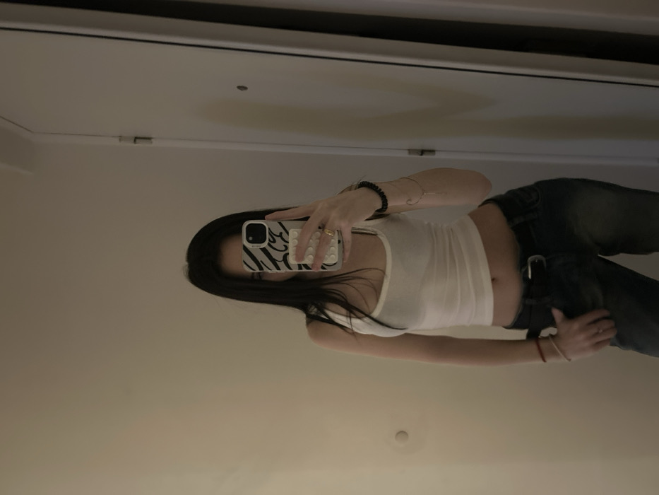 A young woman takes a mirror selfie. She wears a white tank top and loose-fitting denim jeans. Her dark hair frames a face partially obscured by a zebra-patterned phone case. She wears bracelets on both wrists, and a ring is visible on her hand holding the phone. The background is a plain, light-colored wall with a simple ceiling.