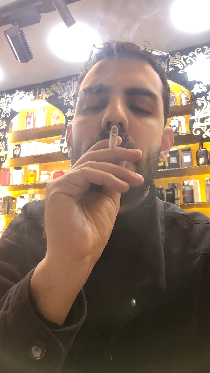 An adult male is depicted indoors in Barza Municipality, Syria, in what appears to be a retail establishment. He is seen from the chest up, with dark hair, a beard, and a mustache. Glasses rest on his head. He is wearing a dark-colored jacket or shirt with visible buttons on the sleeve. The subject is holding a lit cigarette between the fingers of his right hand, positioned near his mouth, with smoke visibly rising around his head. His eyes appear closed or heavily lidded. The background features multiple illuminated shelves displaying numerous bottles of varying shapes and sizes, suggestive of a perfume or fragrance shop. Ornate, dark-patterned decorative elements are visible on the wall behind the shelves. Overhead, track lighting and circular ceiling lights provide illumination.