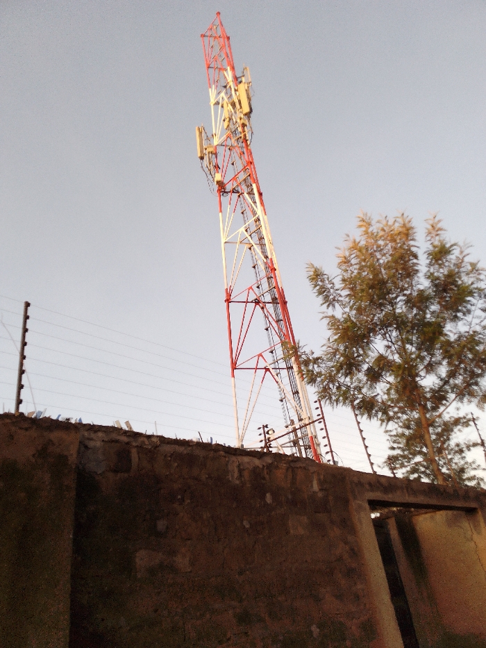 A tall red and white communication tower stands behind a high, weathered concrete wall