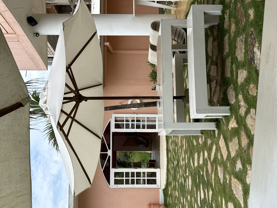 A sun umbrella casts shade over a scene featuring a pink building. A white-framed window is visible on the building. The foreground shows a white picnic table set on a stone and grass courtyard. Wicker chairs are partially visible behind the table. Another open umbrella is partially seen to the left. The scene suggests an outdoor dining or lounge area.