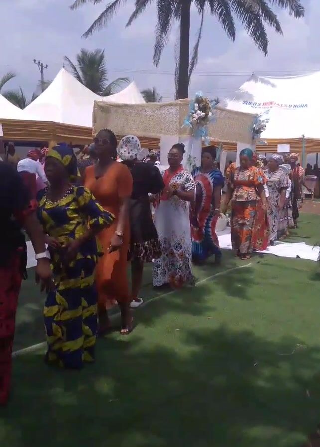group of women in colorful, patterned dresses walking on green turf. They are near white tents and a decorated archway, under the shade of a palm tree. Some of the women are wearing headwraps. One woman pauses in the line to sing into a small microphone.