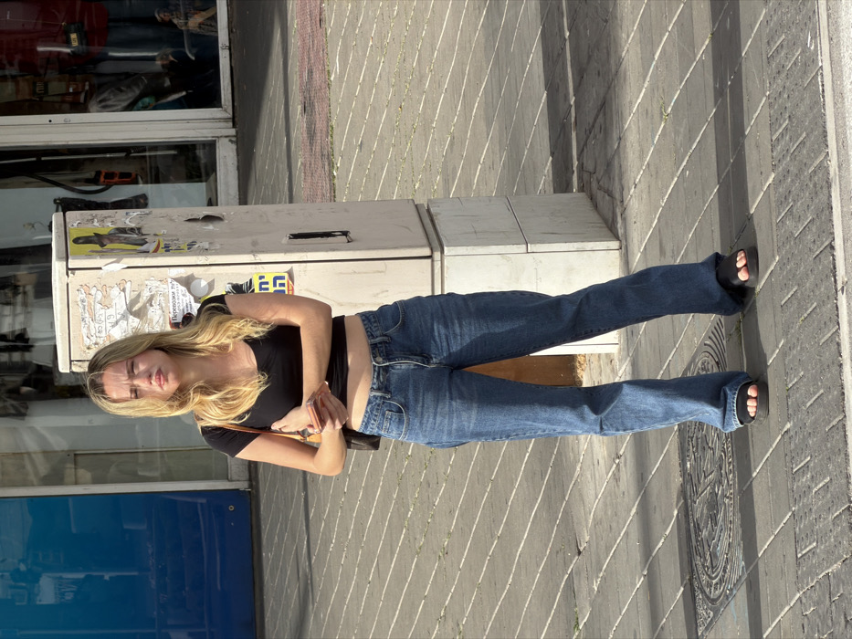 A lone female individual is depicted standing on a paved city sidewalk in Bat Yam, Israel, during daylight hours. The subject is a light-skinned woman with long blonde hair, dressed in a black short-sleeved crop top, blue jeans, and black open-toed sandals. She holds a light-colored smartphone horizontally in her left hand across her midsection, with her right arm folded. A brown shoulder bag strap is visible over her right shoulder. Her expression is neutral, and she looks directly forward, slightly to her left. To her immediate right stands a light-colored, rectangular utility pillar, heavily covered with various weathered posters and papers, some displaying Hebrew and Russian text. The background includes a blue storefront entrance on the left and a shop window with merchandise visible through reflections on the right. The pavement consists of grey rectangular tiles with diagonal grooves, and a circular metal manhole cover is present near the subject's feet. Strong, elongated shadows are cast across the sidewalk, indicating a sunny environment.
