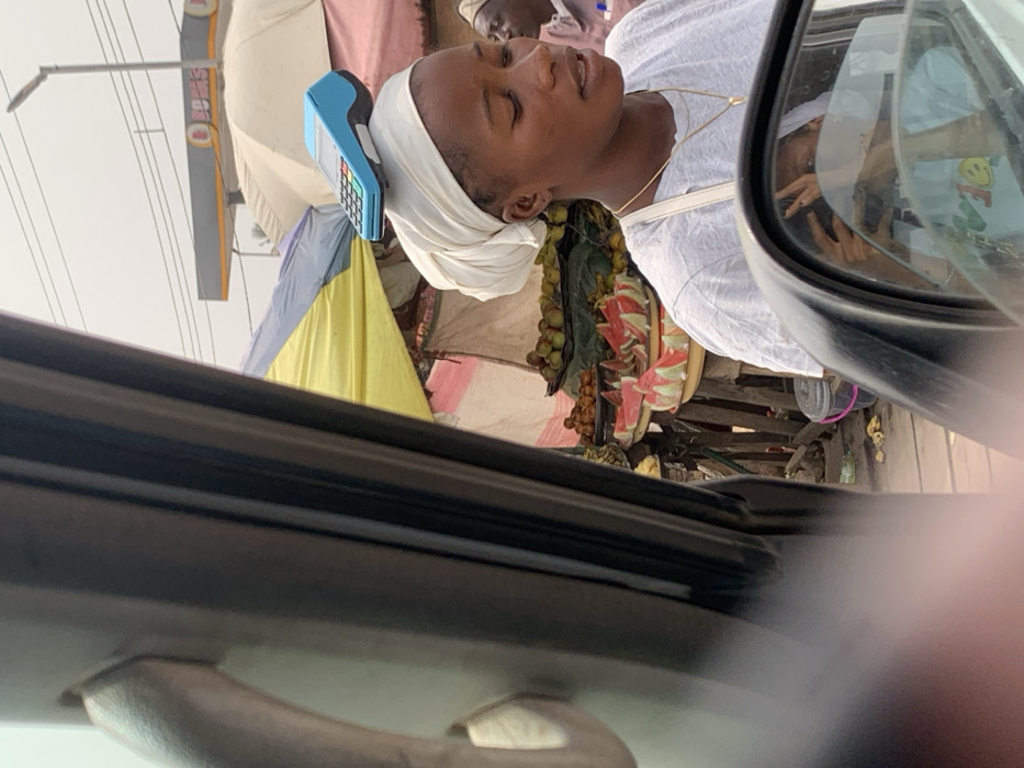 The image depicts an outdoor street scene in Oko Erin, Nigeria, observed from inside a vehicle. In the foreground, the dark interior frame of a car's window and pillar is visible on the left, with a side mirror on the lower right reflecting hands holding a phone, one forming a peace sign. The central figure is a young adult female, likely a vendor, positioned next to the vehicle. She wears a white headwrap, upon which a light blue point-of-sale (POS) terminal is balanced. She is dressed in a light grey t-shirt and has a thin gold chain with a pendant around her neck. Her gaze is directed towards the left, outside the frame. Behind her, a vibrant market stall or roadside setup is visible. Colorful tarpaulins or umbrellas, predominantly yellow and blue, provide overhead shelter. Produce is displayed on wooden stands: numerous slices of watermelon are arranged on flat, round trays, alongside bowls of other fruits, possibly apples or similar round items. The ground beneath the stall shows some debris, including discarded fruit peels and a small plastic bucket. In the mid-ground, a partially visible male figure wearing a light-colored cap or turban stands to the right of the female vendor. In the background, power lines traverse a hazy sky, and a gas station sign, partially displaying "Q Beni's," is visible.