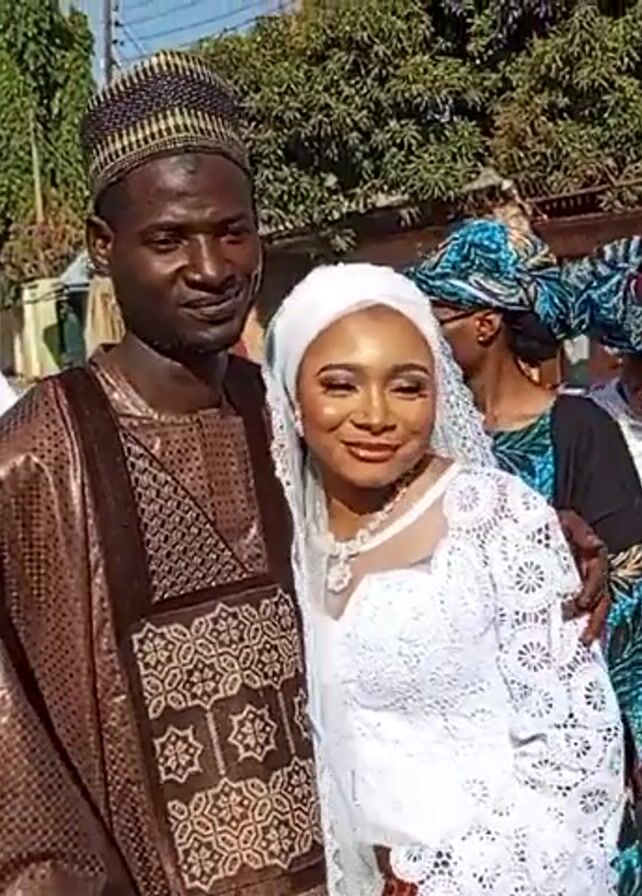 A wedding in progress. A couple, the groom in a brown traditional robe and matching cap, and the bride in a white lace dress and hijab, stand close together smiling for the camera. They are surrounded by other people, some in traditional clothing. A black SUV is parked nearby. The location appears to be a residential area, with buildings and foliage visible in the background.
