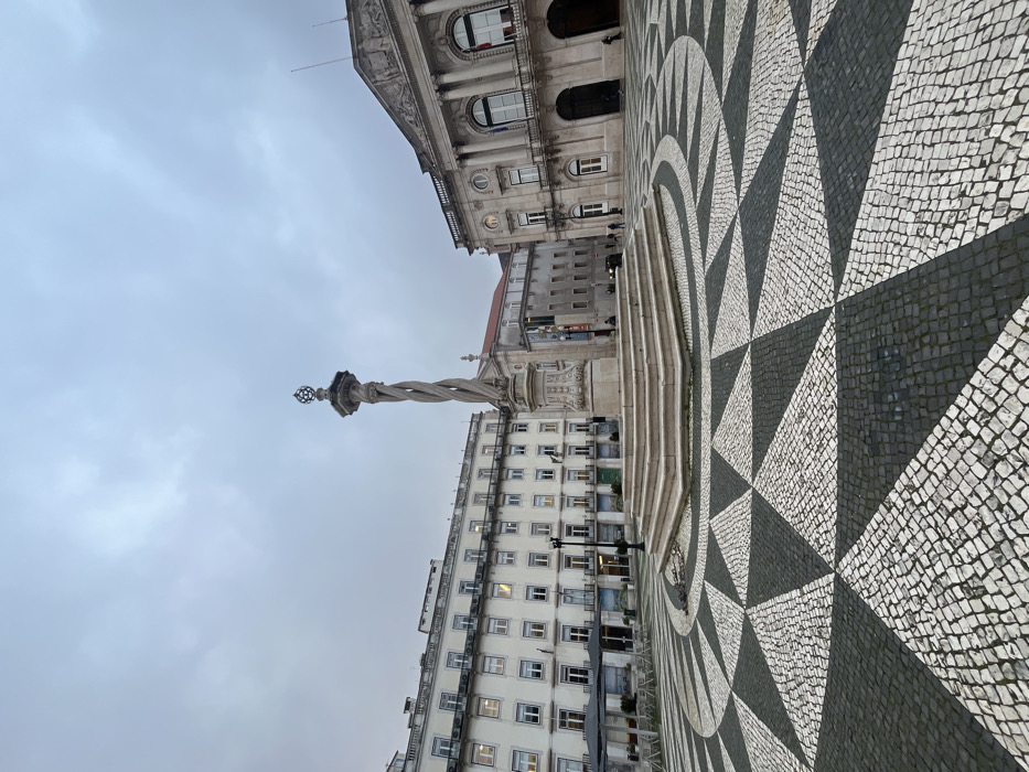 A vertical shot shows a patterned cobblestone plaza on a cloudy day. The black and white design radiates outwards. A tall, ornate pillar with a twisted shaft stands prominently, juxtaposed against a building with multiple windows. The composition features a classic European architectural style.