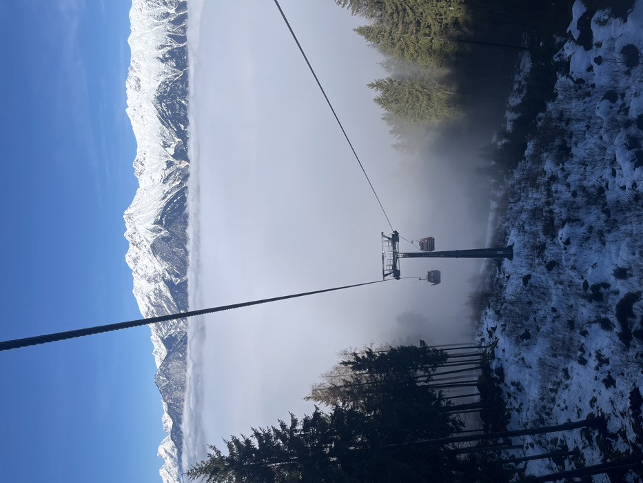 The image displays an elevated view of a mountain landscape near Innsbruck, Austria, dominated by a pronounced cloud inversion. A clear, brilliant blue sky spans the top portion, beneath which a vast, uniform layer of dense white clouds extends horizontally. Above this cloud layer, the rugged, snow-covered peaks of the Nordkette mountain range, part of the Karwendel Alps, are sharply defined against the sky. In the foreground, a gondola system is visible, descending through a coniferous forest partially obscured by localized mist and shadows. A tall, dark grey metal gondola support tower stands on a snow-dusted, rocky slope. Two gondola cabins, one dark grey and one reddish-orange, are suspended from the cables in proximity to the tower. Dense evergreen trees, primarily conifers, populate the slopes on both the left and right sides, their lower sections enveloped by atmospheric mist that merges with the cloud layer. The upper clouds and mountain peaks are brightly illuminated by direct sunlight, while the lower slopes and forest exhibit diffused light. No people are discernible within the gondola cabins or on the visible terrain.
