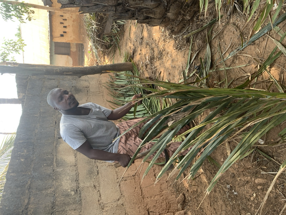 The image captures an outdoor scene within an unpaved residential or semi-rural area in Unknown, Unknown. An adult male, appearing to be of African descent, with a short haircut, is centrally positioned and stooping forward. He is dressed in a light grey short-sleeved t-shirt and light-colored patterned shorts, which display repeated "BALENCIAGA" text. He holds a dark-handled cutting tool, consistent with a machete, in his right hand. His left hand is near a cluster of green palm fronds lying on the reddish-brown earth. The man is looking directly towards the camera. The immediate environment consists of dry, reddish-brown soil scattered with numerous green and dried palm fronds, with a notable pile of fronds in the mid-ground right. A light-colored concrete block wall runs along the left side of the frame. In the background, a single-story building with a light brown, possibly mud-plastered exterior and a corrugated metal roof is visible. This building features a single window opening with a dark grate or shutter. A slender tree trunk stands upright in the mid-ground right, next to a thicker tree trunk on the far right. The scene is illuminated by natural daylight, suggesting an daytime capture.