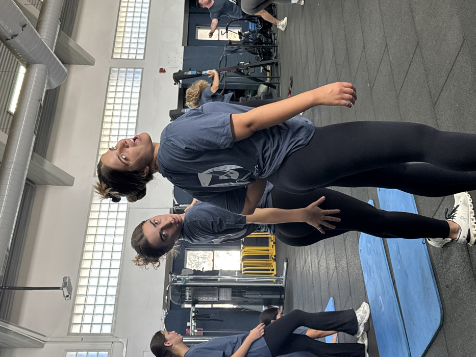 The image depicts an indoor fitness center, identified as being in Netanya, Israel. In the immediate foreground, two females with dark hair, wearing matching dark blue short-sleeve t-shirts and black leggings, are positioned facing away from the camera, looking back over their right shoulders. The female on the right has her hair in a messy bun and exhibits an open-mouthed expression directed towards the camera. The female positioned slightly behind and to her left has her hair tied up and is also looking at the camera with a neutral expression. Her right hand is placed on her left glute. Both individuals wear athletic shoes, with the left individual's white On Cloud shoes clearly visible. The dark blue t-shirts bear a light-colored logo and Hebrew text on the back, including "מכינה קדם צבאית - בילו" (Pre-military academy - Bilu) and "בנייה והנדסה" (Construction and Engineering). The floor consists of dark gray interlocking rubber gym mats, with two blue exercise mats laid out in the mid-ground. In the background, several other individuals are visible engaging in exercises around various gym equipment, including cable machines, a stationary bike, and other weight training apparatus. The facility features high, light-colored ceilings with visible structural beams and suspended fixtures, while the upper walls are constructed with horizontal bands of translucent glass blocks.