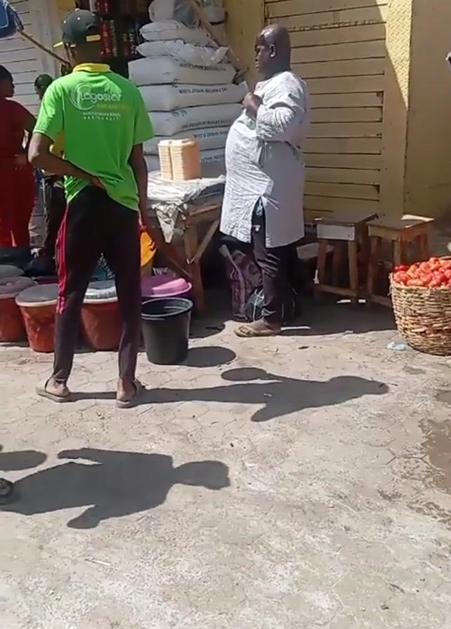 n outdoor market scene. There are several people walking around, and a man in a white robe is standing near a closed shopfront, possibly talking to someone out of frame. Another man wearing a green shirt is standing with his back to the camera, looking at the man in white. There are bags of what appear to be grain piled up against the shop, as well as containers of tomatoes, and other assorted goods. The environment is sunlit, with shadows cast by the people and objects. The ground appears to be a paved surface, perhaps concrete. A few other people walk by.