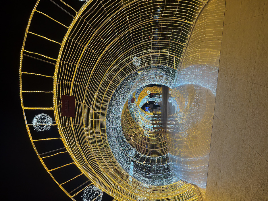 The image displays a brightly lit pedestrian pathway within Soho Square, Sharm El Sheikh, Egypt, during nighttime. The primary visual elements are a series of interconnected arched tunnels constructed from metal frameworks adorned with numerous LED lights. These tunnels exhibit an alternating pattern of warm golden-yellow and cool white-blue lights, extending into the distance and creating a perspective effect. Several spherical light fixtures, primarily white, are suspended within the arches of the structures. A dark red rectangular sign, bearing the illuminated text "SOHO" in white, hangs from the upper framework. The ground beneath the tunnels is a highly reflective, light-colored surface that mirrors the intricate light patterns, enhancing the overall luminescence of the scene. A group of approximately five to seven individuals is observed standing or walking further down the illuminated pathway within the tunnel, their forms partially obscured by distance and light. A dark-colored, low railing or fence runs along the left side of the pathway within the initial tunnel segment. The background is dark, indicating a nocturnal setting.