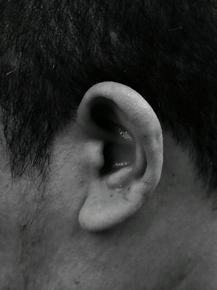 - "A close-up, monochromatic photographic capture depicts the right external ear and adjacent integument of a human subject" by FM-TFbiB3, licensed under CC BY 4.0