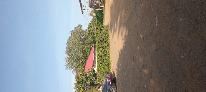 The image depicts an outdoor scene in Kisumu, Kenya, under a clear, cloudless blue sky. The foreground consists of bare, reddish-brown earth interspersed with small stones and scattered debris, exhibiting multiple irregular shadows. In the lower-left quadrant, the rear left section of a dark blue sedan with a yellow license plate is parked, facing away from the viewer. A dense, well-trimmed green hedge forms a barrier across the midground. Behind this hedge, a single-story building with a prominent red-tiled hip roof and a white facade is partially visible, surrounded by lush green trees. To the right of the hedge, an elevated utility structure is present, featuring wooden posts supporting a corrugated metal roof, beneath which two large, black plastic water storage tanks are visible. Overhead lines or cables traverse the upper right portion of the frame. The background is characterized by numerous trees with abundant green foliage, including one large tree with visible purple-tinged blooms or leaves. No people, specific actions, or interactions are discernible within the scene.