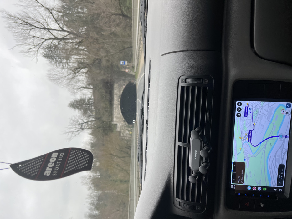 The scene captures an interior view from a vehicle, looking forward through the windshield towards a road and a tunnel in Veliko Tarnovo, Bulgaria, under an overcast sky. In the foreground, a black, teardrop-shaped air freshener labeled "areon SPORT LUX" hangs from the rearview mirror. The vehicle's grey dashboard is visible across the bottom, featuring two central air vents. A black "BOROFONE" brand phone holder, with a multi-pronged grip, is clamped onto the left air vent. Below the vents, an integrated infotainment screen displays a navigation map. The map clearly shows the city of Veliko Tarnovo, Bulgaria, with the vehicle positioned on "ул. Христо Ботев" (Hristo Botev Street), approaching a tunnel next to the Yantra River. The navigation indicates a remaining distance of 910 meters, an estimated time of 2 minutes for 3.3 kilometers, and the current time as 15:29. A speed limit of 48 km/h is also displayed on the map interface. Outside the vehicle, a two-lane asphalt road extends directly towards a stone-arch tunnel entrance, which is dark internally. Two distinct, bright lights, resembling vehicle headlights, are visible emerging from within the tunnel. A metal guardrail lines the right side of the road. The surrounding environment consists of hillsides covered with primarily bare deciduous trees and some evergreens, suggesting a non-summer season. The sky is uniformly grey and cloudy. The tunnel is specifically identified as the one located on Hristo Botev Street in Veliko Tarnovo.